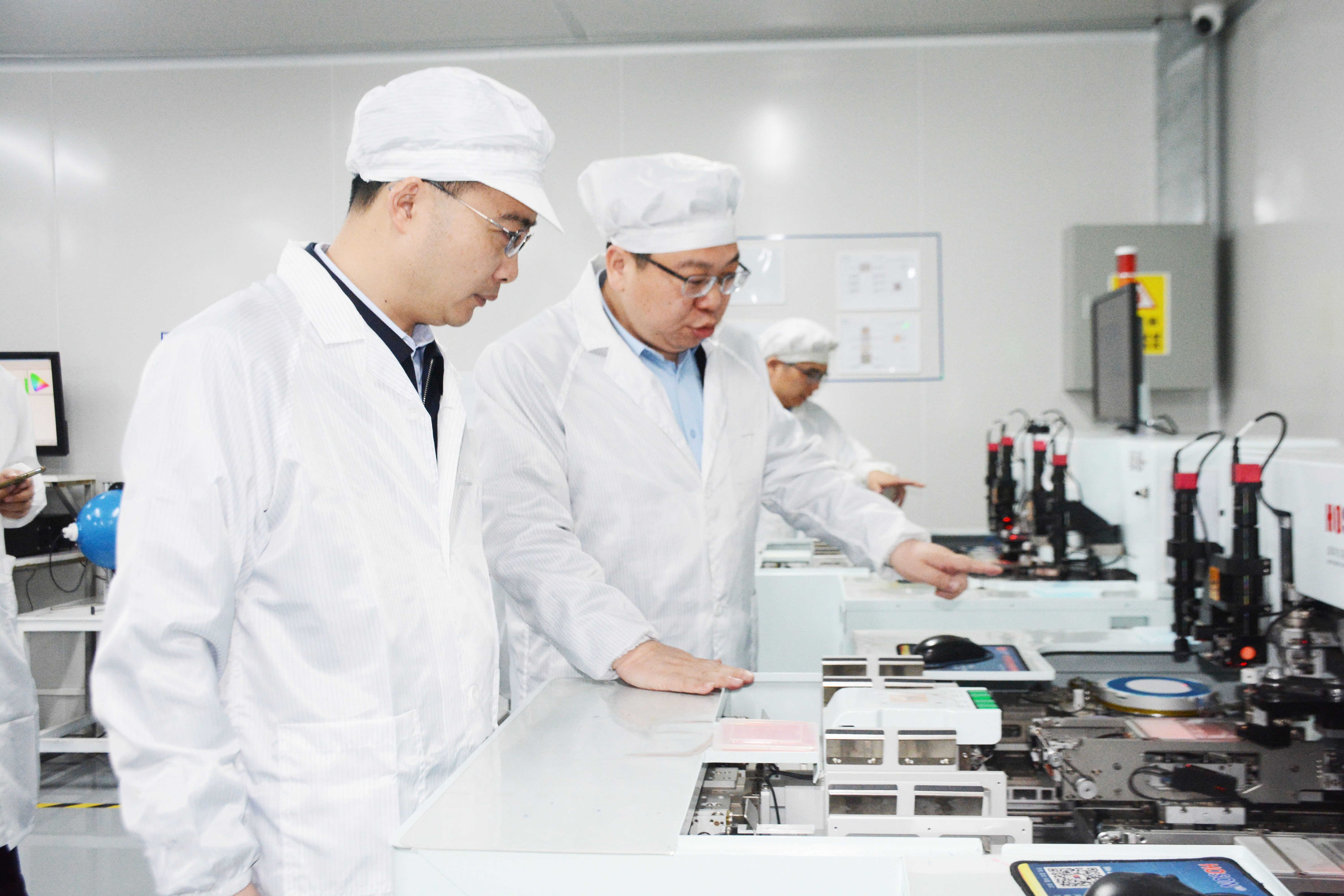 隨后一行人來到微型CSP芯片級封裝器件制成車間、LED柔性燈帶自動化生產(chǎn)車間和Mini背光生產(chǎn)車間進(jìn)行參觀,參觀過程中,張市長詳細(xì)了解了CSP芯片級封裝工藝原理、Mini背光生產(chǎn)制造流程等。張市長對我司生產(chǎn)基地環(huán)境和先進(jìn)設(shè)備,以及現(xiàn)今的自動化生產(chǎn)工藝表示稱贊。