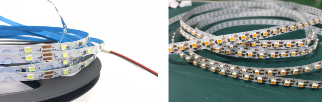 應(yīng)用在SMD燈帶上的燈珠通常是“2835”即尺寸為2.8mm*3.5mm。SMD燈帶因燈珠尺寸較大,燈珠密度不能做高。另一方面對(duì)比于CSP長(zhǎng)城型燈帶,SMD S型燈帶折彎時(shí)容易斷裂,柔韌性差,不當(dāng)操作,容易使燈珠支架破裂。